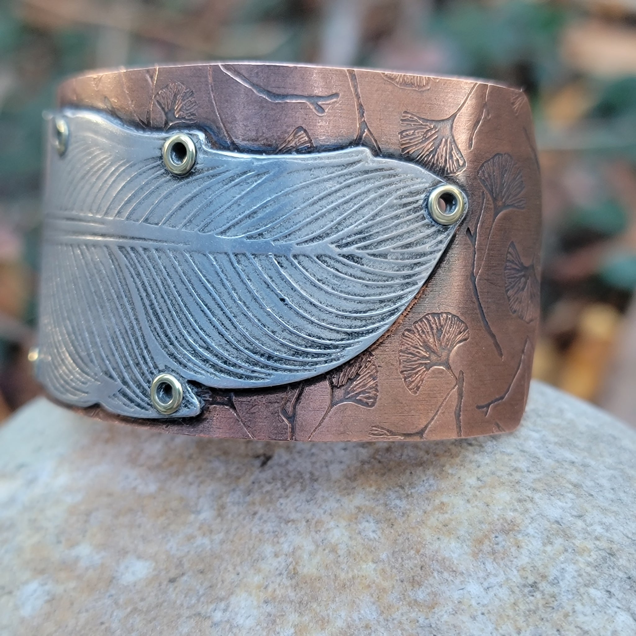 These adjustable rustic cuff bracelets have been fabricated in Copper and aluminum. Both metals have been imprinted with designs by using a die and a rolling mill. The first is imprinted with a ginkgo leaf pattern and will fit a medium sized wrist. The 2nd has a birds on a wire pattern and will fit a larger wrist. Both have textured aluminum bird feathers that are made by putting aluminum sheet and a texture plate through a rolling mill, and then sawing out and sanding the feathers. The feathers are connected to the cuff with rivets.