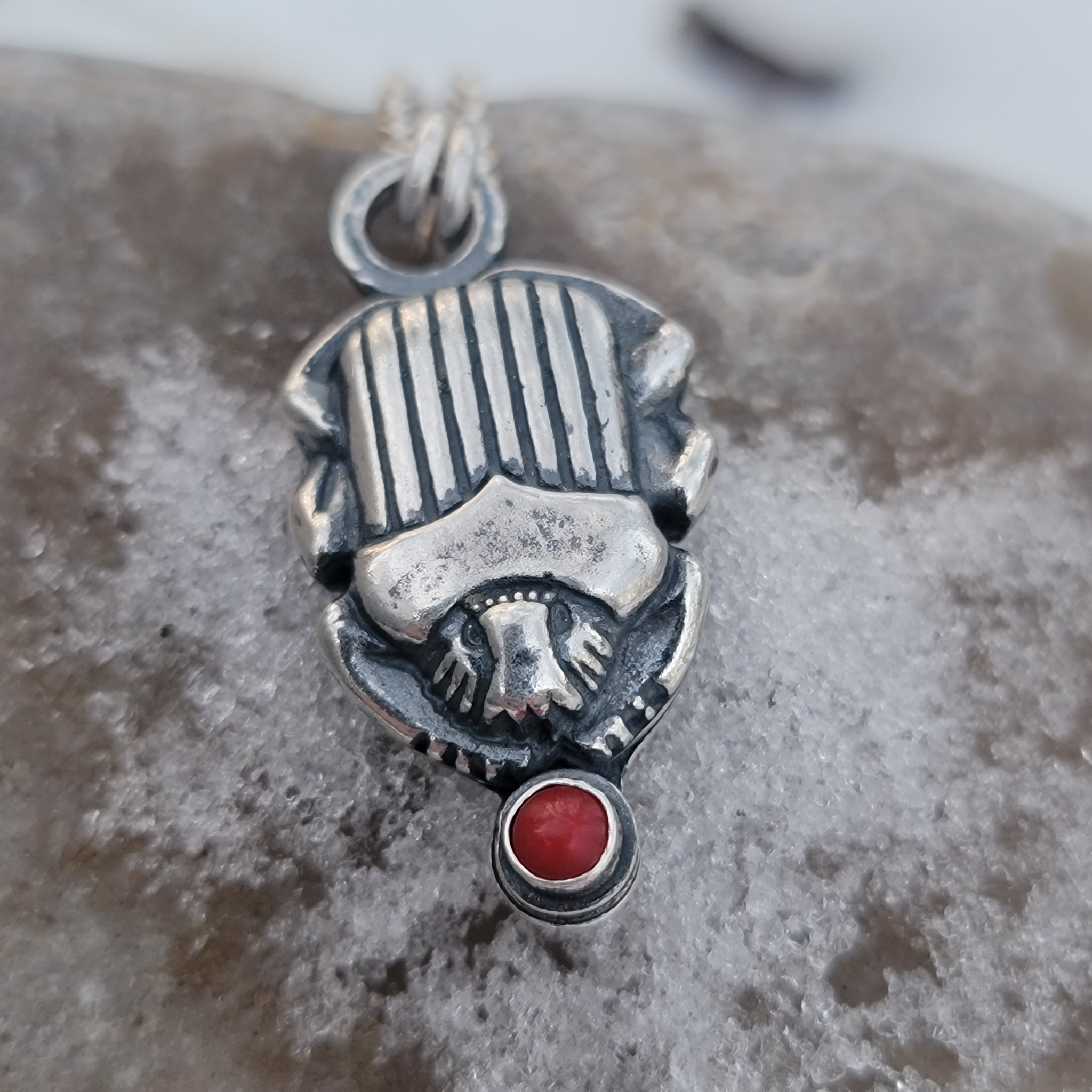 These Scarab beetle pendants were created entirely in several layers of fine and recycled sterling silver. One has a 4mm red coral cabochon & one has a 4mm turquoise cabochon. The pieces are oxidized in liver of sulphur, and polished to bring out highlights. Bright sterling silver 20" rolo chain with lobster clasp closure.